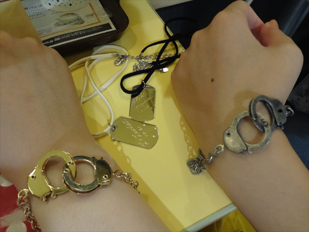 で、おそろいのもの欲しいね!みたいな話になって、手錠がいいねって話になって、探しに探し、金と銀の手錠のブレスレット買いました!