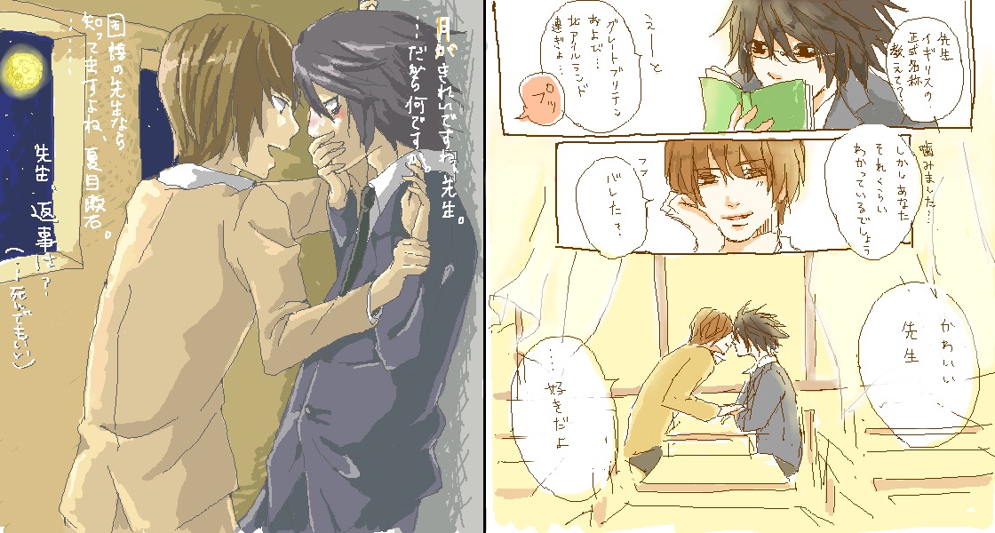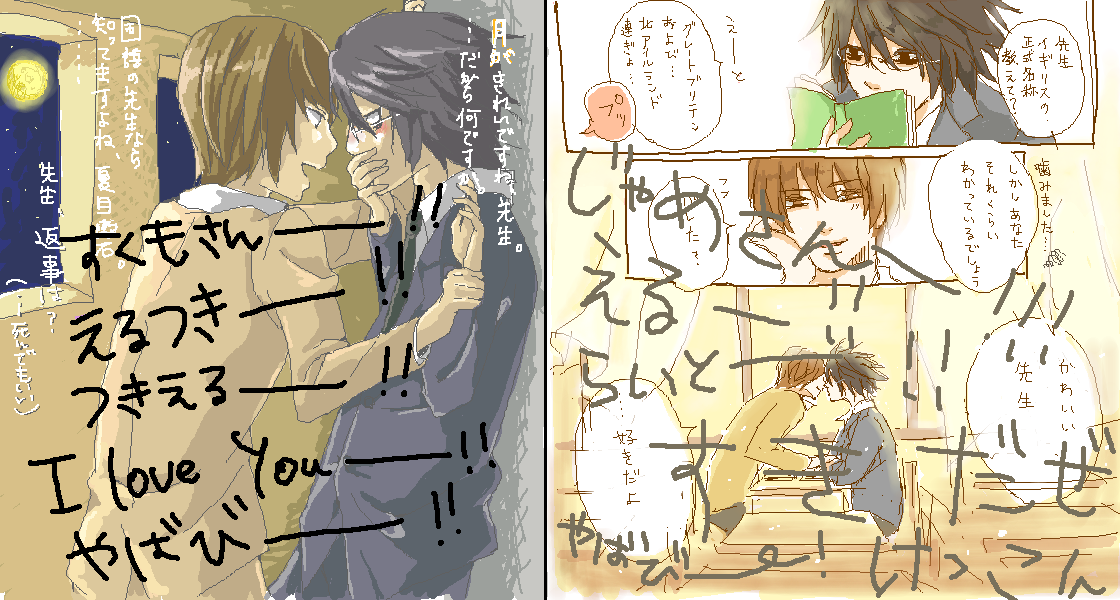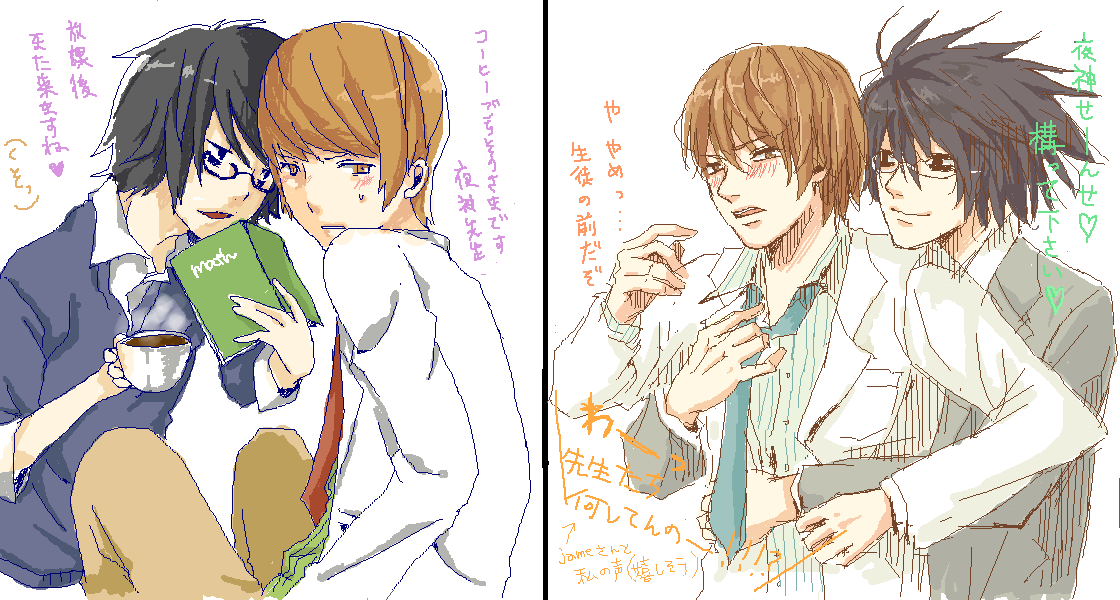 「竜崎先生は休み時間になるといつも保健室を訪れて、夜神先生に悩みを聞いてもらうんだよ。夜神先生は励ますどころか辛口でむしろ竜崎先生を罵倒するようなことしか言わないんだけど、ちゃんとコーヒーは出してくれるし何だかんだ聞いてくれるからそれを竜崎先生は気づいていて全部見透かしてるぞっていう余裕な笑みで左上みたいな台詞を吐くの。そして放課後は竜崎先生の 特 別 授 業 なんだよ!!!あと右上みたいなことを普通に生徒の前でやっちゃって生徒に『先生たちホモかよー!(笑)』ってからかわれたら竜崎先生はニヤニヤしながら『さあどうでしょう?』って言うから夜神先生は必死でフォローするんだけど否定しなかったことが内心嬉しくて私も嬉しい」